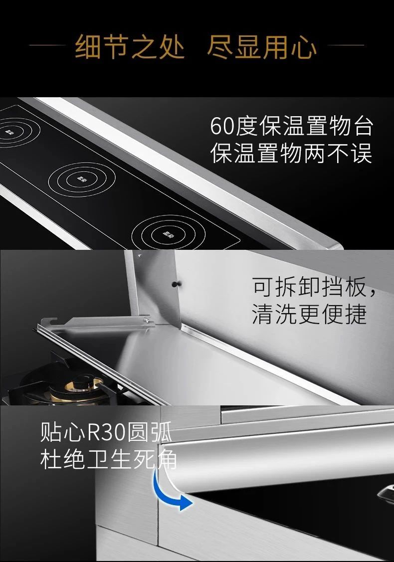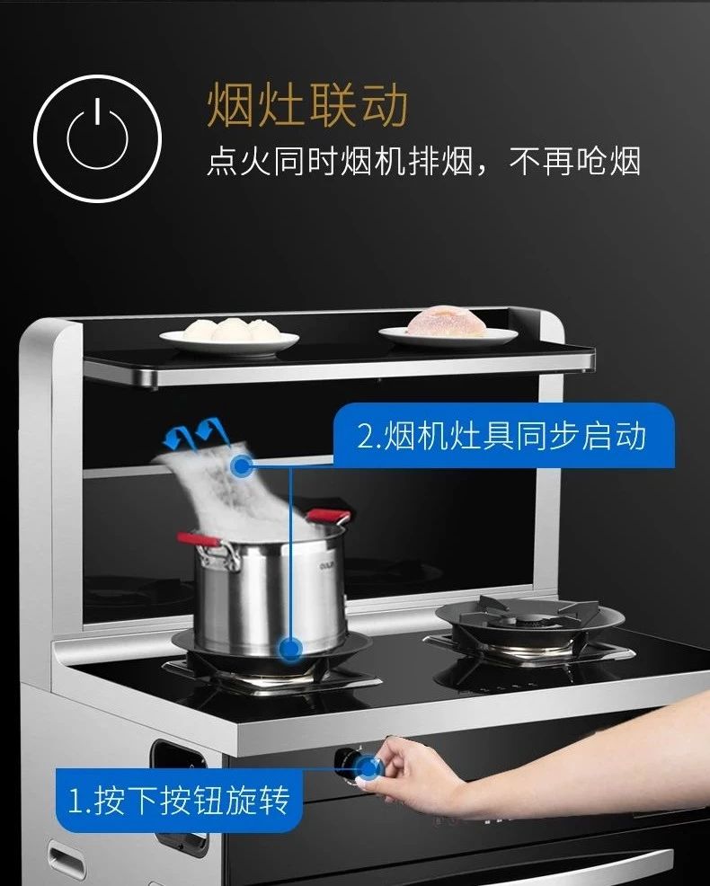 省心功能-煙灶聯動和煙蒸聯動設計,在開啟灶具的同時煙機亦會同步啟動,告別遺忘和煙熏火燎 。