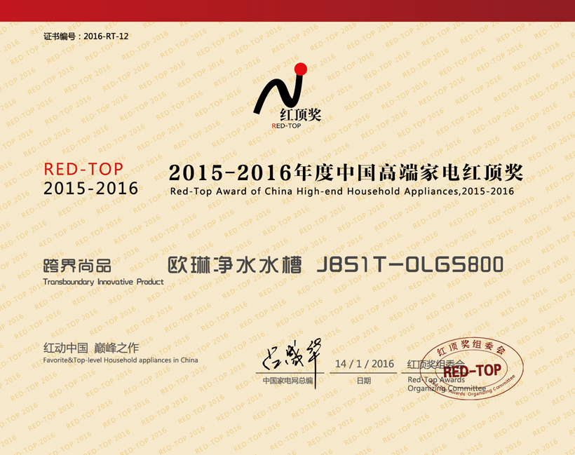 2016開年,歐琳“凈水水槽”又憑借水槽電器化、智能化的創(chuàng)新,與三星、西門子家電等國際品牌一起,榮獲第七屆中國高端家電“紅頂獎”,這也是歐琳2016開門紅第一獎。