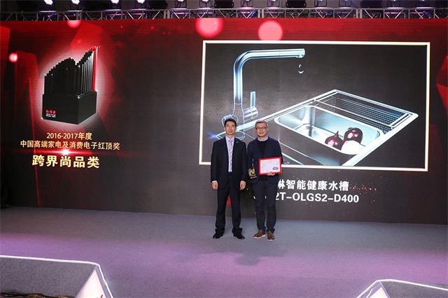 1月14日,由中國家用電器協會指導、紅頂獎組委會主辦的“2016-2017中國高端家電與消費電子趨勢發布暨紅頂獎頒獎典禮如期而至,數十家國內外知名電子與消費電子品牌和上百家中外媒體,共同見證24個紅頂獎產品的誕生。歐琳凈水水槽跨界尚品是盛會唯一一款創意跨界水槽產品。